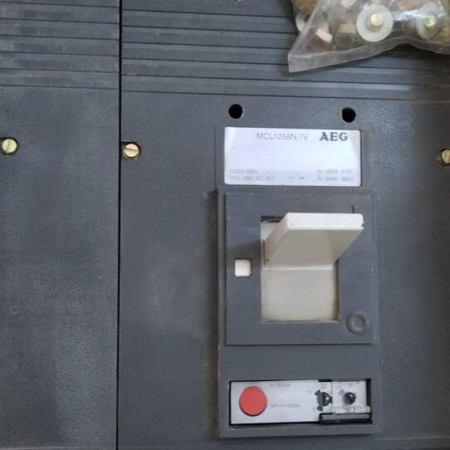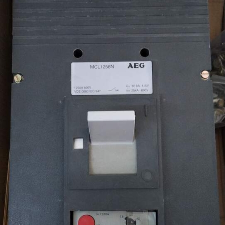 • AEG MCL1258N 1000A 3-pole 60kA @415V circuit breaker, industrial-grade, grey housing with model label and connection points.
