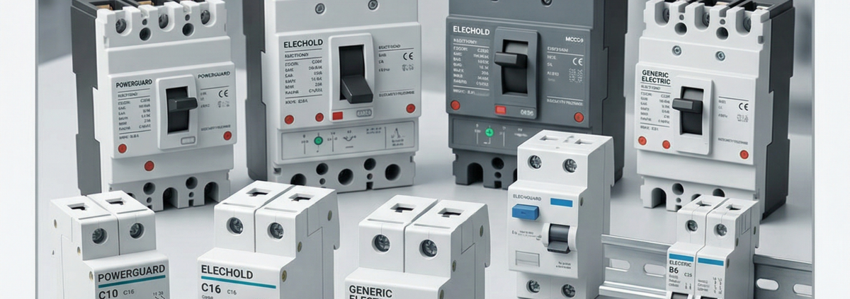Miniature circuit breakers (MCBs), moulded case circuit breakers (MCCBs), air circuit breakers (ACBs), residual current devices (RCDs/RCBOs), and motor protection circuit breakers. Trusted brands including ABB, Siemens, Schneider, AEG, Hager, Eaton, ETI, and GE. Available in 1P, 2P, 3P, and 4P configurations from 0.5A to 6300A.