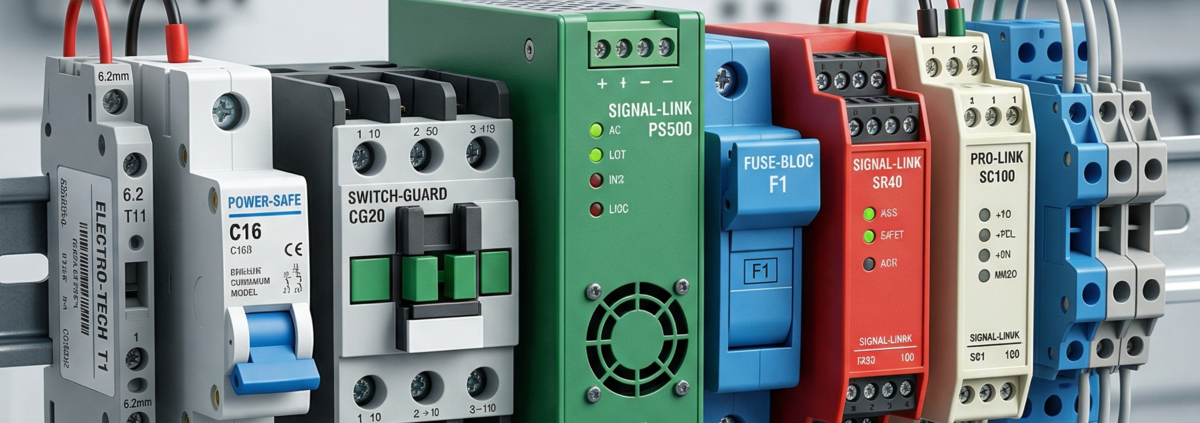 Standard and mini DIN rails (TS35 and TS15), mounting plates, mounting brackets, rail end stops, and panel mounting accessories. Essential structural components for organizing devices inside electrical panels.