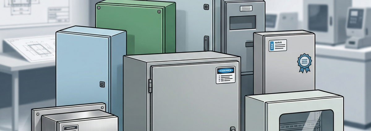 Metal and plastic enclosures, distribution boards, modular consumer units, floor-standing cabinets, wall-mount boxes, and IP-rated housings. Rittal, ABB, Schneider, and Hager enclosures from IP20 to IP66 for indoor and outdoor installations.