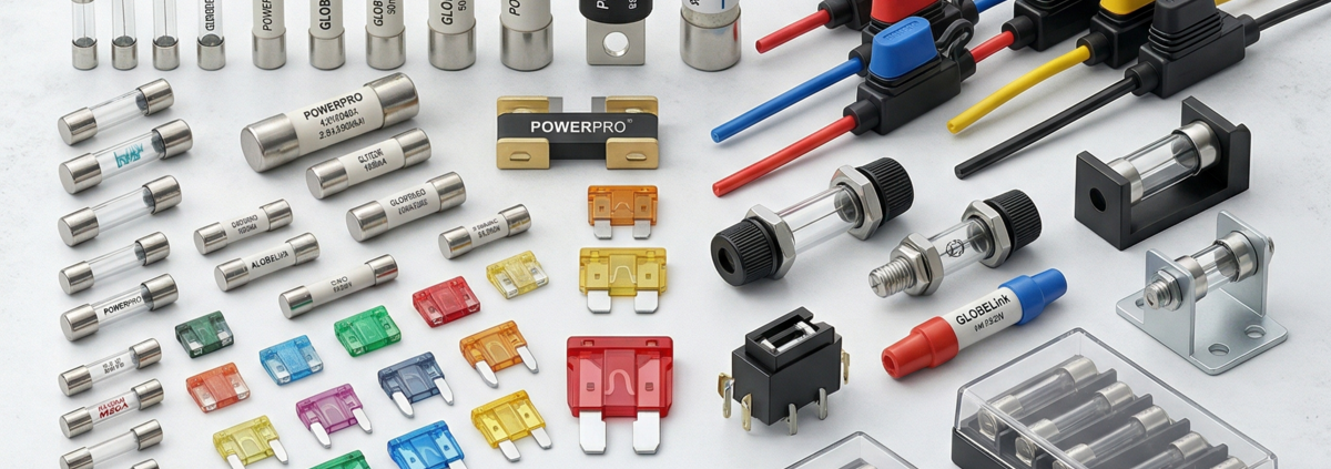 HRC fuses (NH and cylindrical), fuse holders, fuse bases, fuse links, and fuse disconnectors. gG, aM, and aR rated fuses from 2A to 1250A for short-circuit protection in industrial and commercial systems.