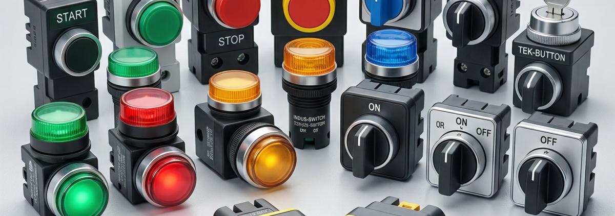 Push buttons, selector switches, pilot lights, indicator lamps, LED signal towers, emergency stop buttons, key switches, and legend plates. Panel-mount operator devices from ABB, Siemens, and Schneider for machine and panel control.