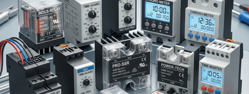 Protection relays, monitoring relays (voltage, current, phase sequence), time relays, timer modules, and relay sockets. Includes earth fault relays, under/over voltage relays, and multifunction timers from Broyce, Siemens, ABB, Schneider, and SEG.