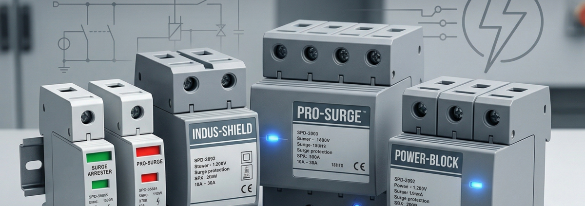 Surge protection devices (SPDs) Type 1, Type 2, and Type 3 for mains protection, data line surge protectors, and replacement cartridges. Protect sensitive equipment from transient overvoltages caused by lightning or switching surges.